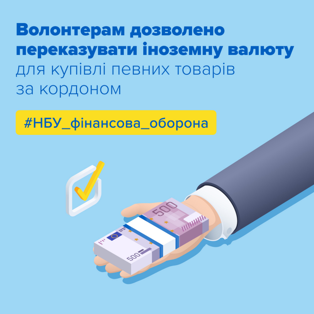 Для сприяння діяльності волонтерів, фізичним особам дозволено переказувати іноземну валюту для купівлі низки товарів за кордоном у межах щомісячного ліміту 400 тис. грн (чотириста тисяч гривень) в еквіваленті (це більше $13,5 тис.).